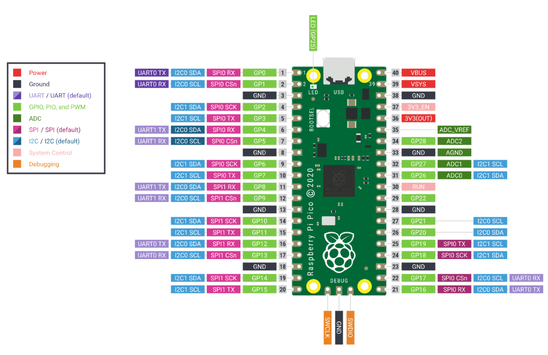 Pin configuration Notes 1.8V to 5.5V of power to VSYS will be regulated to 3.3V must connect GND Micropython Firmware Download here! Hold down bootsel button and plug in rasp pico copy paste firmware into the usb device that appears