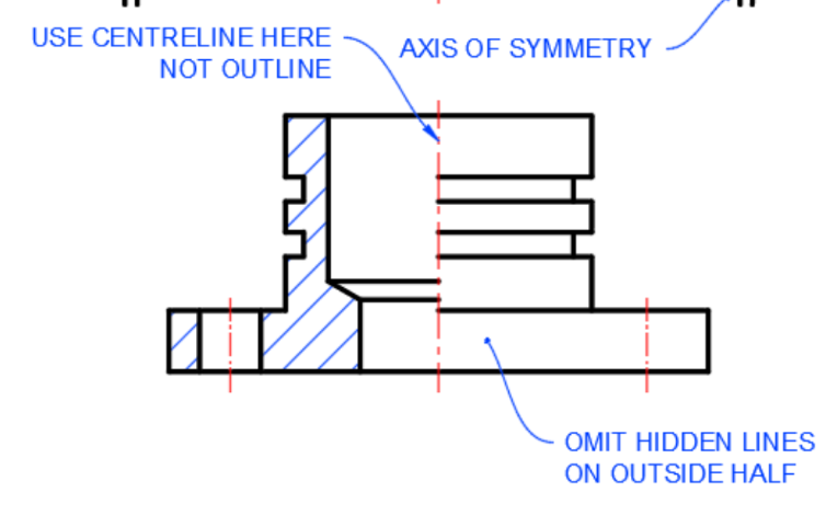 Centre lines - for symmetrical axis, bolt circles and path of motion