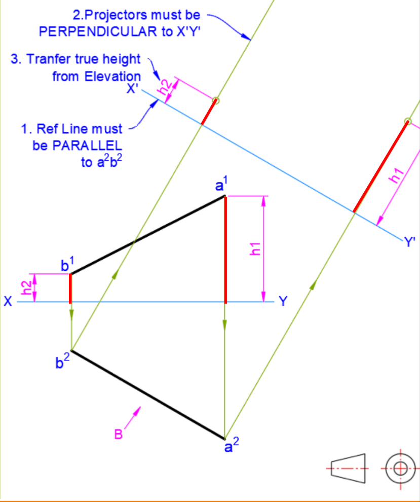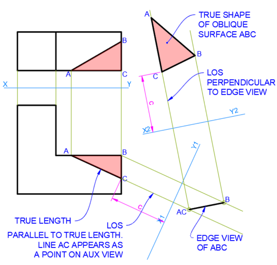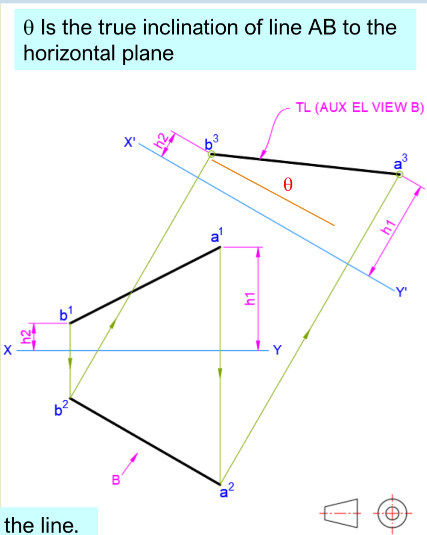 - Aux view perpendicularly to that line to find edge view (where plane is seen as a line)