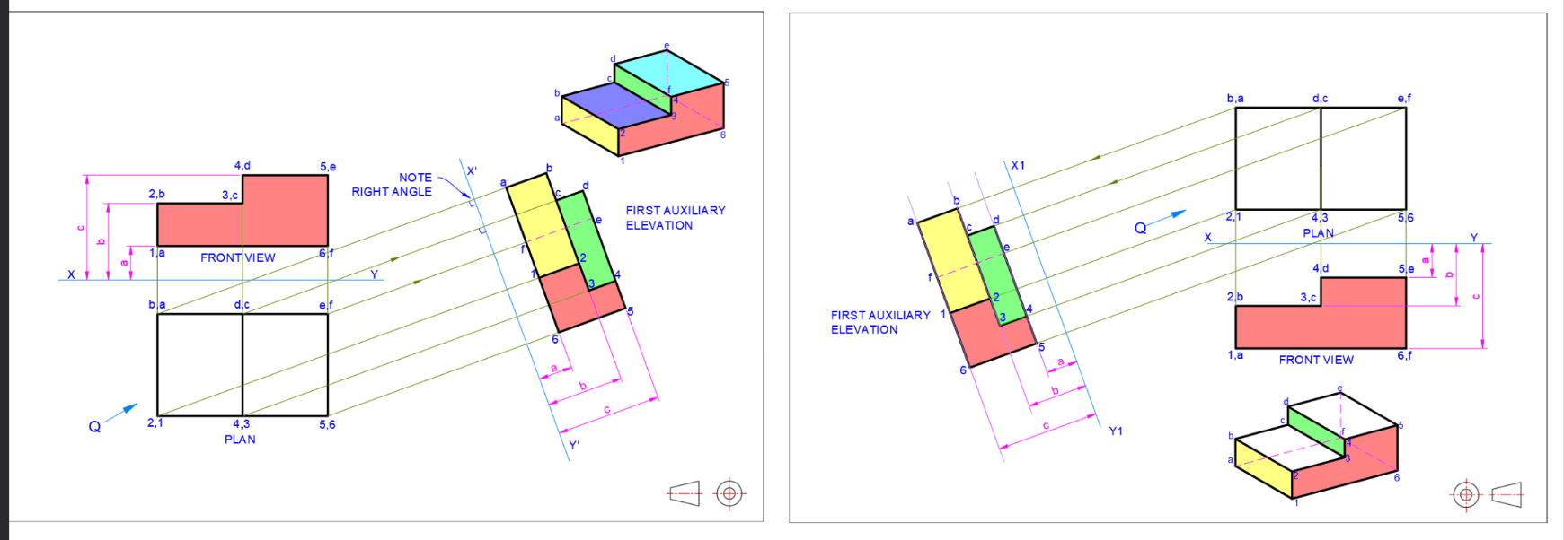 First angle is projected past the sight-line while third angle is projected back towards the sight-line