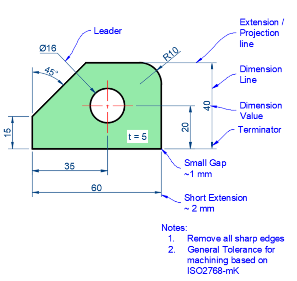 - Extension lines should have a visible gap from view and extend beyond dimension line