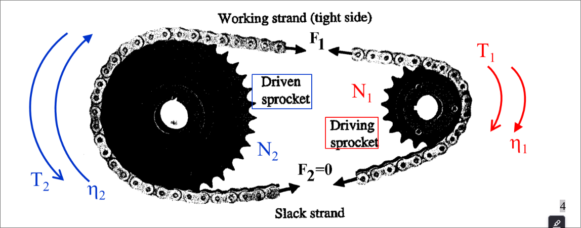 One side of the strand is always slack with zero tension and power is transmitted solely by the tight side tension, which explains why chain drives generate a smaller shaft load than belt drives.
