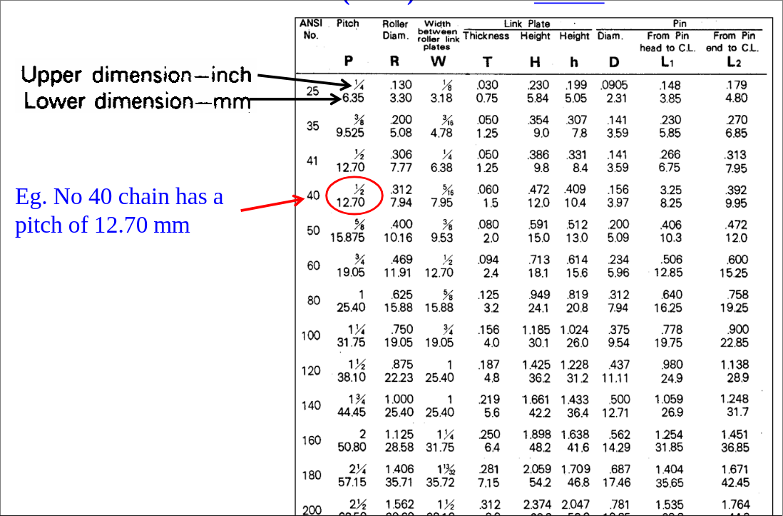 - The dimensions of standard sizes for a single strand chain specified by American National Standards Institute (ANSI) is shown in Table 1.